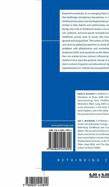 Kidworld contributes to an emerging field of childhood studies that challenges disciplinary boundaries, in such fields as early childhood education and developmental psychology, which are limited in their beliefs and relationships with younger human beings. One role of childhood studies is to recognize the historical-, political-, and even power-oriented contexts that construct childhood, giving voice to issues that have been previously ignored and disqualified. The authors of Kidworld employ their own diverse, global perspectives to reveal the existence of and problems with globalization and marketing of the universal, modernist child. Such questions as the following are addressed: How are market-driven motives influencing the lives of (poor) children? How does the political climate of a nation affect children's cultural, linguistic, and educational rights? Can more just representation for children be accomplished?