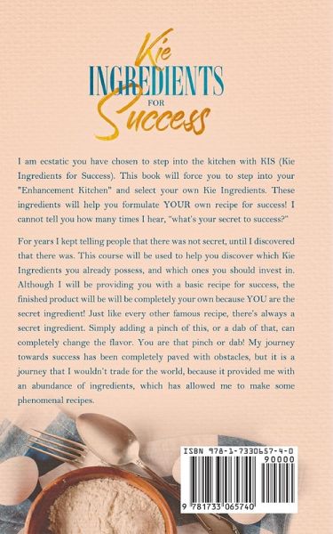 I am ecstatic you have chosen to step into the kitchen with KIS (Kie Ingredients for Success). This book will force you to step into your "Enhancement Kitchen" and select your own Kie Ingredients. These ingredients will help you formulate YOUR own recipe for success! I cannot tell you how many times I hear, "what's your secret to success?" For years I kept telling people that there was not secret, until I discovered that there was. This course will be used to help you discover which Kie Ingredients you already possess, and which ones you should invest in. Although I will be providing you with a basic recipe for success, the finished product will be will be completely your own because YOU are the secret ingredient! Just like every other famous recipe, there's always a secret ingredient. Simply adding a pinch of this, or a dab of that, can completely change the flavor. You are that pinch or dab! My journey towards success has been completely paved with obstacles, but it is a journey that I wouldn't trade for the world, because it provided me with an abundance of ingredients, which has allowed me to make some phenomenal recipes.