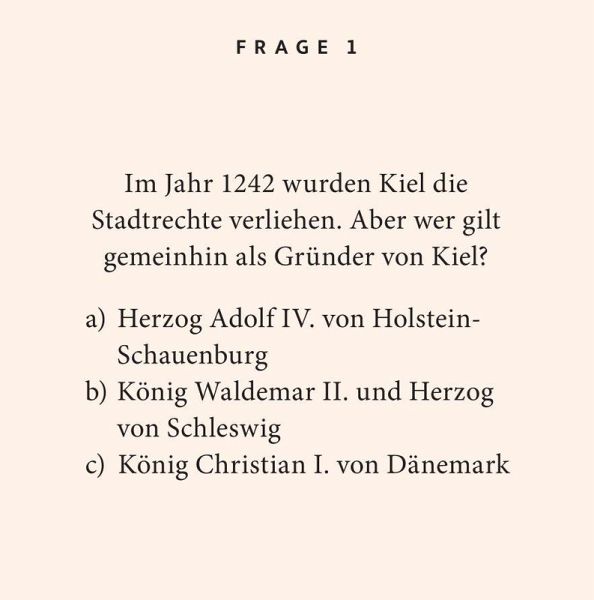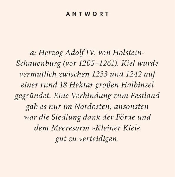 Moin aus Kiel! Wer denkt da nicht gleich an die Kieler Woche, das weltgrößte Segelevent, oder an die berühmten, zart geräucherten Kieler Sprotten? Doch die Stadt an der Förde hält noch viele weitere Superlative, überraschende Entdeckungen und staunenswerte Fakten parat, die Sibille Fuhrken in 100 Fragen und Antworten kenntnisreich und unterhaltsam aufdeckt. Für alle, die Kiel lieben und die Marinestadt spielerisch noch besser kennenlernen wollen!Stilvoll, elegant und immer eine gute Idee: Die Reihe "Quiz im Quadrat" präsentiert sich in modernem Design und sorgt für unterhaltsamen Rätselspaß - verpackt in einer edlen Geschenkbox. Perfekt als besondere 'Grußkarte' mit Mehrwert - zum Verschenken oder Selberfreuen!