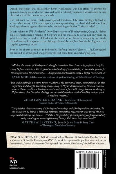 Danish theologian and philosopher Søren Kierkegaard was not afraid to express his opinions. Living amid what he perceived to be a culturally lukewarm Christianity, he was often critical of his contemporary church. But that does not mean Kierkegaard rejected traditional Christian theology. Indeed, at a time when many of his contemporaries were questioning the classical doctrine of God, Kierkegaard swam against the stream by maintaining orthodox Christian beliefs. In this volume in IVP Academic's New Explorations in Theology series, Craig A. Hefner explores Kierkegaard's reading of Scripture and his theology to argue not only that the great Dane was a modern defender of the doctrine of divine immutability (or God's changelessness) in response to the disintegration of the self, but that his theology can be a surprising resource today. Even as the church continues to be beset by "shifting shadows" (James 1:17), Kierkegaard can remind us of the good and perfect gifts that come from an unchanging God.