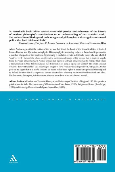 Alison Assiter argues that the notion of the person that lies at the heart of the liberal tradition is derived from a Kantian and Cartesian metaphysic. This metaphysic, according to her, is flawed and it permeates a number of aspects of the tradition. Significantly it excludes certain individuals, those who are labelled 'mad' or 'evil'. Instead she offers an alternative metaphysical image of the person that is derived largely from the work of Kierkegaard. Assiter argues that there is a strand of Kierkegaard's writing that offers a metaphysical picture that recognises the dependence of people upon one another. He offers a moral outlook, derived from this, that encourages people to 'love' one another. Inspired by Kierkegaard, Assiter goes on to argue that it is useful to focus on needs rather than rights in moral and political thinking and to defend the view that it is important to care about others who may be far removed from each one of us. Furthermore, she argues, it is important that we treat those who are close to us, well.