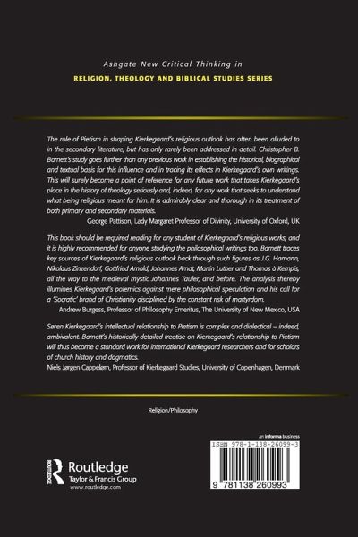 'The role of Pietism in shaping Kierkegaard's religious outlook has often been alluded to in the secondary literature, but has only rarely been addressed in detail. Christopher B. Barnett's study goes further than any previous work in establishing the historical, biographical and textual basis for this influence and in tracing its effects in Kierkegaard's own writings. This will surely become a point of reference for any future work that takes Kierkegaard's place in the history of theology seriously and, indeed, for any work that seeks to understand what being religious meant for him. It is admirably clear and thorough in its treatment of both primary and secondary materials.' George Pattison, Lady Margaret Professor of Divinity,University of Oxford, UK 'This book should be required reading for any student of Kierkegaard's religious works, and it is highly recommended for anyone studying the philosophical writings too. Barnett traces key sources of Kierkegaard's religious outlook back through such figures as J. G. Hamann, Nikolaus Zinzendorf, Gottfried Arnold, Johannes Arndt, Martin Luther, and Thomas à Kempis, all the way to the medieval mystic Johannes Tauler, and before. The analysis thereby illumines Kierkegaard's polemics against mere philosophical speculation and his call for a Socratic brand of Christianity disciplined by the constant risk of martyrdom.' Andrew Burgess, Professor of Philosophy Emeritus, The University of New Mexico, USA 'Søren Kierkegaard's intellectual relationship to Pietism is complex and dialectical - indeed, ambivalent. Barnett's historically detailed treatise on Kierkegaard's relationship to Pietism will thus become a standard work for international Kierkegaard researchers and for scholars of church history and dogmatics'. Niels Jørgen Cappelørn, Professor of Kierkegaard Studies, University of Copenhagen, Denmark '... Barnett's Kierkegaard, Pietism and Holiness will one day become a seminal work on this issue