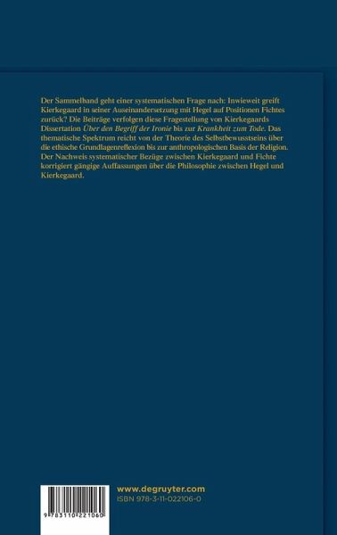 Bereits die frühesten Journale aus der Studentenzeit lassen Søren Kierkegaards Beschäftigung mit J. G. Fichtes Bestimmung des Menschen erkennen. Der Einfluss dieser Schrift stand - neben der frühen Wissenschaftslehre - im Zentrum der bisherigen Erforschung des Verhältnisses Kierkegaards zu Fichte. Der Umfang von Kierkegaards Fichte-Kenntnis lässt sich unter philologischen Gesichtspunkten nur schwer bestimmen. Die Leitfrage des vorliegenden Sammelbandes ist daher eine systematische: Inwieweit greift Kierkegaard in seiner Auseinandersetzung mit Hegels absolutem Idealismus auf Prinzip, Methode, Terminologie und praktische Absichten Fichte'schen Denkens zurück? Die Beiträge des Sammelbandes verfolgen diese Fragestellung von Kierkegaards Dissertation Über den Begriff der Ironie (1841) bis zur Krankheit zum Tode (1849). Das thematische Spektrum reicht von der Theorie des Selbstbewusstseins über die ethische Grundlagenreflexion bis zur anthropologischen Basis religiöser Selbstinterpretationen. Der Nachweis systematischer Bezüge zwischen beiden Autoren leistet einen wichtigen Beitrag zur Verortung von Kierkegaards philosophischen Schriften im Diskussionskontext des Deutschen Idealismus. Er korrigiert gängige Auffassungen über den Weg der Philosophie zwischen Hegel und Kierkegaard.