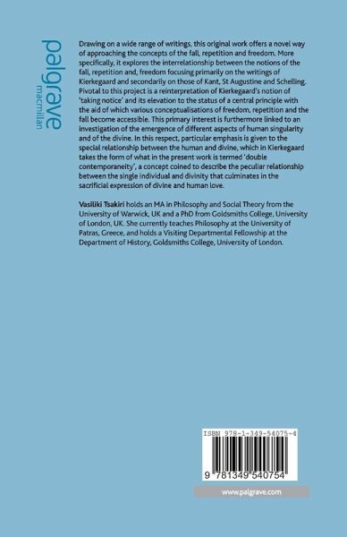 Series Editor's Preface Acknowledgements Abbreviations 'Taking Notice': An Introduction PART I: ANXIETY AND INDIVIDUALITY The Topos of Anxiety Anxiety, Death and the Leap PART II: TIME, HISTORY AND THE FALL: ST. AUGUSTINE AND KANT St. Augustine on Fallen and Redeemed Time History, Fall, Freedom: Reflections on Kant PART III: FREEDOM AND ETERNITY: SCHELLING'S SAGA Schelling's Conception of Freedom and Identity Theo-cosmo-gony: Eternal Past and Human Freedom PART IV: KIERKEGAARD'S CREED OF FAITH: CONTEMPORANEITY AND REPETITION Repetition: A Transcendent Movement Towards Faith Double Contemporaneity, or the Paradox of Repetition Concluding Thoughts Postscript: 'Taking Notice'/On Tarkovsky's Sacrifice Notes Bibliography Index