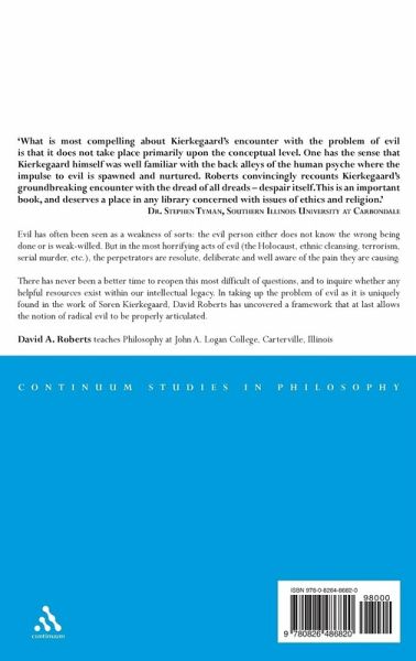 For thousands of years philosophers and theologians have grappled with the problem of evil. Traditionally, evil has been seen as a weakness of sorts: the evil person is either ignorant, or weak-willed. But in the most horrifying acts of evil, the perpetrators are resolute, deliberate, and well aware of the pain they are causing. Here David Roberts painstakingly details the matrix of issues that evolved into Kierkegaard's own solution. Kierkegaard's psychological understanding of evil is that it arises out of despair - a despair that can become so vehement and ferocious that it lashes out at existence itself. Roberts shows how the despairing self can become strengthened and intensified through a conscious and free choice against the Good. This type of radical evil is neither ignorant nor weak.