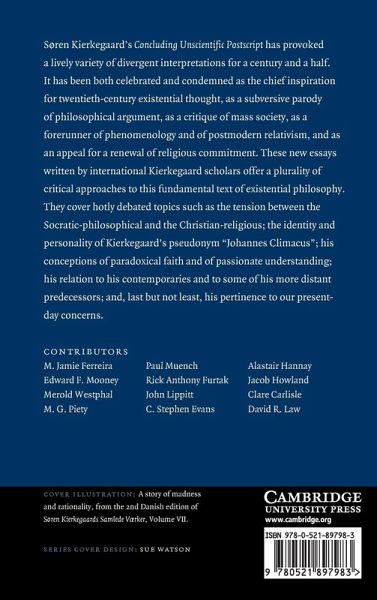 Søren Kierkegaard's Concluding Unscientific Postscript has provoked a lively variety of divergent interpretations for a century and a half. It has been both celebrated and condemned as the chief inspiration for twentieth-century existential thought, as a subversive parody of philosophical argument, as a critique of mass society, as a forerunner of phenomenology and of postmodern relativism, and as an appeal for a renewal of religious commitment. These 2010 essays written by international Kierkegaard scholars offer a plurality of critical approaches to this fundamental text of existential philosophy. They cover hotly debated topics such as the tension between the Socratic-philosophical and the Christian-religious; the identity and personality of Kierkegaard's pseudonym 'Johannes Climacus'; his conceptions of paradoxical faith and of passionate understanding; his relation to his contemporaries and to some of his more distant predecessors; and, last but not least, his pertinence to our present-day concerns.
