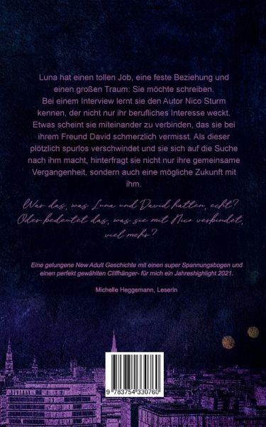 Luna hat einen tollen Job, eine feste Beziehung und einen großen Traum: Sie möchte schreiben. Bei einem Interview lernt sie den Autor Nico Sturm kennen, der nicht nur ihr berufliches Interesse weckt. Etwas scheint sie miteinander zu verbinden, das sie bei ihrem Freund David schmerzlich vermisst. Als dieser plötzlich spurlos verschwindet und sie sich auf die Suche nach ihm macht, hinterfragt sie nicht nur ihre gemeinsame Vergangenheit, sondern auch eine mögliche Zukunft mit ihm.War das, was Luna und David hatten, echt? Oder bedeutet das, was sie mit Nico verbindet, viel mehr?