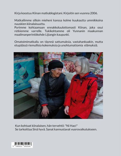 Kirjani koostuu matkablogistani. Kirjoitin sen vuonna 2006. Matkailimme silloin mieheni kanssa kolme kuukautta ummikkoina merkkien valtakunnassa, Kiinassa. Pyrimme kohtaamaan ennakkoluulottomasti kiinalaisia, jotka osuivat retkiemme varrelle. Tukikohtamme oli Yunnanin maakunnan maailmanperintökohde Lijiangin kaupunki. Omatoimimatkailu on täynnä sattumuksia, vastahankaakin, mutta etupäässä riemullisia kokemuksia. Kiinalainen tervehtii sanomalla "Ni hao!" Se tarkoittaa Sinä hyvä. Se on positiivinen tervehdys ja kutsuu vuoropuheluun.