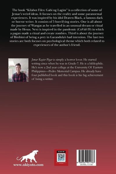 The book "Kilabot Files: Gabi ng Lagim" is a collection of some of Jemar's weird ideas. It focuses on the reality and some paranormal experiences. It was inspired by his idol Draven Black, a famous dark or horror writer. It consists of 5 horrifying stories. One is all about the journey of Wangas as he travelled in an unusual dream or ritual made by Hesus. Next is inspired in the pandemic (CoVid-19) in which a pagan made a ritual and create zombies. Third is about the journey of Binibini of being a prey in Garandula's bad intention. The last two stories are both focuses on psychological theme which both related to experiences of the author's friend.