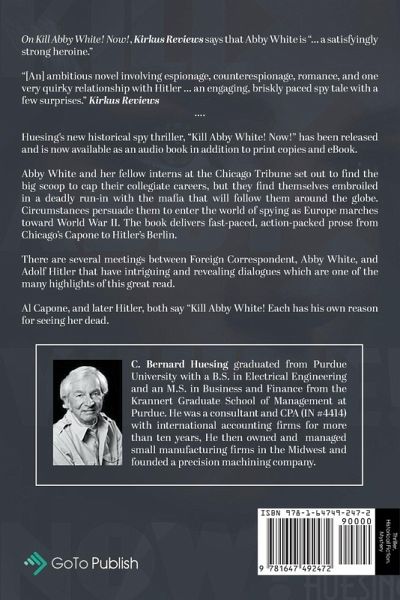 Huesing's new historical spy thriller, "Kill Abby White! Now!" has been released and is now available as an audio book in addition to print copies and eBook. Abby White and her fellow interns at the Chicago Tribune set out to find the big scoop to cap their collegiate careers, but they find themselves embroiled in a deadly run-in with the mafia that will follow them around the globe. Circumstances persuade them to enter the world of spying as Europe marches toward World War II. The book delivers fast-paced, action-packed prose from Chicago's Capone to Hitler's Berlin. There are several meetings between Foreign Correspondent, Abby White, and Adolf Hitler that have intriguing and revealing dialogues which are one of the many highlights of this great read. Al Capone, and later Hitler, both say "Kill Abby White! Each has his own reason for seeing her dead.