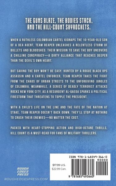 THE GUNS BLAZE, THE BODIES STACK, AND THE KILL-COUNT SKYROCKETS. When a ruthless Colombian cartel kidnaps the 10-year-old son of a DEA agent, Team Reaper unleashes a relentless storm of bullets and bloodshed. Their mission to save the boy uncovers a chilling conspiracy-a dirty alliance that reaches deeper than the devil's own heart. But saving the boy won't be easy. Hunted by a rogue black ops assassin and a cartel enforcer, Team Reaper takes the fight from the chaos of urban streets to the unforgiving jungles of Colombia. Meanwhile, a series of deadly terrorist attacks rocks New York City, as a resurgent al-Qaeda sparks a political firestorm that threatens to topple the President. With a child's life on the line and the fate of the nation at stake, Team Reaper doesn't back down. They'll stop at nothing to crush their enemies-no matter the cost. Packed with heart-stopping action and high-octane thrills, Kill Count is a must-read for fans of military thrillers.