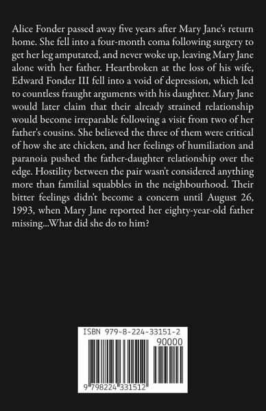 Alice Fonder passed away five years after Mary Jane's return home. She fell into a four-month coma following surgery to get her leg amputated, and never woke up, leaving Mary Jane alone with her father. Heartbroken at the loss of his wife, Edward Fonder III fell into a void of depression, which led to countless fraught arguments with his daughter. Mary Jane would later claim that their already strained relationship would become irreparable following a visit from two of her father's cousins. She believed the three of them were critical of how she ate chicken, and her feelings of humiliation and paranoia pushed the father-daughter relationship over the edge. Hostility between the pair wasn't considered anything more than familial squabbles in the neighbourhood. Their bitter feelings didn't become a concern until August 26, 1993, when Mary Jane reported her eighty-year-old father missing...What did she do to him?
