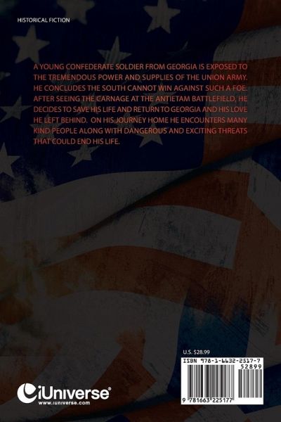 A YOUNG CONFEDERATE SOLDIER FROM GEORGIA IS EXPOSED TO THE TREMENDOUS POWER AND SUPPLIES OF THE UNION ARMY. HE CONCLUDES THE SOUTH CANNOT WIN AGAINST SUCH A FOE. AFTER SEEING THE CARNAGE AT THE ANTIETAM BATTLEFIELD, HE DECIDES TO SAVE HIS LIFE AND RETURN TO GEORGIA AND HIS LOVE HE LEFT BEHIND. ON HIS JOURNEY HOME HE ENCOUNTERS MANY KIND PEOPLE ALONG WITH DANGEROUS AND EXCITING THREATS THAT COULD END HIS LIFE.