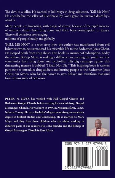 The devil is a killer. He wanted to kill Muya in drug addiction. "Kill Me Not!" He cried before the sellers of illicit brew. By God's grace, he survived death by a whisker. Many people are lamenting, with pangs of sorrow, because of the rapid increase of untimely deaths from drug abuse and illicit brew consumption in Kenya. These evil behaviors are ravaging millions of people locally and globally. "KILL ME NOT" is a true story how the author was transformed from evil behaviors when he surrendered his miserable life to the Redeemer, Jesus Christ. He escaped death from drug abuse; This book is a memoir of redemption. Today the author, Bishop Muya, is making a difference in rescuing the youth and the community from drug abuse and alcoholism. His big campaign against this threatening menace is dubbed "I Shall Not Die!" This inspiring book is written purposely to introduce drug-addicts and hurting people to the Redeemer, Jesus Christ our Savior, who has the power to save, deliver and transform mankind from all sins and evil behaviors.
