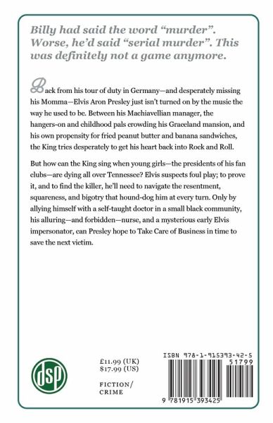 Billy had said the word "murder". Worse, he'd said "serial murder". This was definitely not a game anymore. Back from his tour of duty in Germany-and desperately missing his Momma-Elvis Aron Presley just isn't turned on by the music the way he used to be. Between his Machiavellian manager, the hangers-on and childhood pals crowding his Graceland mansion, and his own propensity for fried peanut butter and banana sandwiches, the King tries desperately to get his heart back into Rock and Roll. But how can the King sing when young girls-the presidents of his fan clubs-are dying all over Tennessee? Elvis suspects foul play; to prove it, and to find the killer, he'll need to navigate the resentment, squareness, and bigotry that hound-dog him at every turn. Only by allying himself with a self-taught doctor in a small black community, his alluring-and forbidden-nurse, and a mysterious early Elvis impersonator, can Presley hope to Take Care of Business in time to save the next victim.