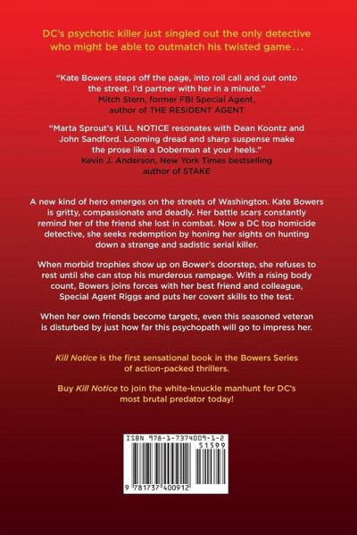 DC's psychopathic killer just singled out the only detective with the skill to outmatch his twisted game. A new kind of hero emerges on the streets of Washington. Kate Bowers is gritty, compassionate and deadly. Her battle scars constantly remind her of the friends she lost in combat. Now one of DC's top homicide detectives, she seeks justice for victims and a little redemption by hunting down a sadistic killer obsessed with capturing her attention. When he taunts Bowers by leaving trophies from his victims on her doorstep, she refuses to rest until she can end his murderous rampage. With a rising body count, Bowers joins forces with her best friend and colleague, Special Agent Steven Riggs and puts her formidable covert skills to the ultimate test. As her own friends become targets, even this seasoned veteran is disturbed by just how far this psychopath will go to impress her. Buy Kill Notice to join the white-knuckle manhunt for DC's most brutal predator today!
