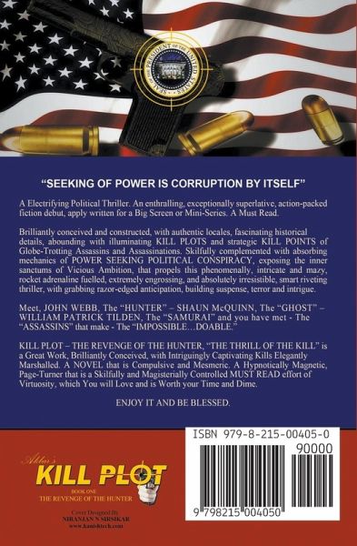 KILL PLOT - THE REVENGE OF THE HUNTER AND THE THRILL OF THE KILL - BOOK ONE AND TWO tracks the metamorphic transformation of three young kids, from three different veins' of society and geographical locales, who under circumstances beyond their control, emerge at the top echelons of a professional trade, known as a "Assassin" The novels details the progress of each of the three as they make their way to the top, via a series of "Hit-Assignments" calumniating into a crescendo, as their individual and professional paths cross, for and against one another. The evolution of the three kids runs parallel to the growth and development of two close friends, and a woman, who, transpire to become the President, of the United States of America. The rise to the highest offices of the country brings into play viciously ambitious power seeking individuals, conspire to assassinate the one, holding the highest office, the President of the United States, thereby emphasising the slogan of the novel, "THE SEEKING OF POWER IS CORRUPTION BY ITSELF" and POWER CORRUPTS - ABSOLUTE POWER CORRUPTS ABSOLUTE. Each "Assignment to Contract" of the three, "Assassins" is a novel by itself. From the Orientation Killing of the power seeking General in West Africa, to the accepting of the contract, from the Nazi's hiding in Argentina, to the revenge killing of the individuals who had killed the parents and sisters of one of the young kids, in Pakistan, to the killing of the Mafia Don in America, to the killing of renowned Drug Smuggler and Casino owner, in the Islands of Seychelles, to the killing of the "Drug Queen" heading the Colombian Cartel, in Bogota, to the KGB sanctioned kill of one of their rouge-agents in America, to the contract to kill the "President of the United States" and the "First Lady of America," to the killing of the Conspirators who had back-tracked on their payments, and many additional Contracts and Kills. The novel takes the reader through the US Presidential Election process, the Afghan Refuge Movement and their presence in the US, and the "The Most Exciting two minutes in sports" The run for the Roses - The Kentucky Derby, while all the time, highlighting and exposing the inner sanctums of Vicious Ambition, that propels this phenomenally, intricate and mazy, rocket adrenaline fuelled, extremely engrossing, and absolutely irresistible, smart riveting