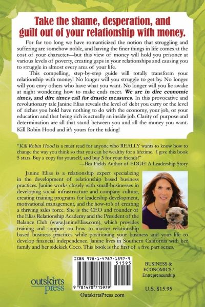 For far too long we have romanticized the notion that struggling and suffering are somehow noble, and having the finer things in life comes at the cost of your character-but this view of money will hold you prisoner at various levels of poverty, creating gaps in your relationships and causing you to struggle in almost every area of your life. This compelling, step-by-step guide will totally transform your relationship with money! No longer will you struggle to get by. No longer will you envy others who have what you want. No longer will you lie awake at night wondering how to make ends meet. We are in dire economic times, and dire times call for drastic measures. In this provocative and revolutionary tale Janine Elias reveals the level of debt you carry or the level of riches you hold have nothing to do with the economy, your job, or your education and that being rich is actually an inside job. Clarity of purpose and determination are all that stand between you and all the money you want. Kill Robin Hood and it's yours for the taking!