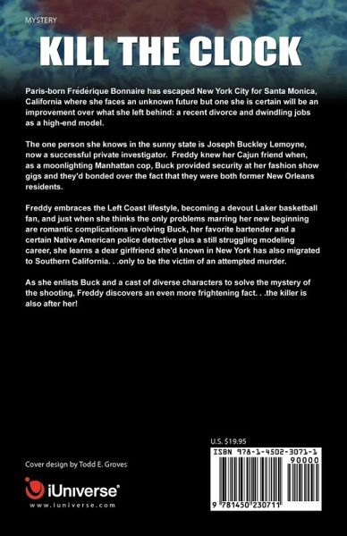 Paris-born Frederique Bonnaire has escaped New York City for Santa Monica, California where she faces an unknown future but one she is certain will be an improvement over what she left behind: a recent divorce and dwindling jobs as a high-end model. The one person she knows in the sunny state is Joseph Buckley Lemoyne, now a successful private investigator. Freddy met her Cajun friend when, as a moonlighting Manhattan cop, Buck provided security at her fashion show gigs and they'd bonded over the fact that they were both former New Orleans residents. Freddy embraces the Left Coast lifestyle, becoming a devout Laker basketball fan, and just when she thinks the only problems marring her new beginning are romantic complications involving Buck, her favorite bartender and a certain Native american police detective plus a still struggling modeling career, she learns a dear girlfriend she'd known in New York has also migrated to Southern California. . .only to be the victim of an attempted murder. As she enlists Buck and a cast of diverse characters to solve the mystery of the shooting, Freddy discovers an even more frightening fact. . .the killer is also after her!