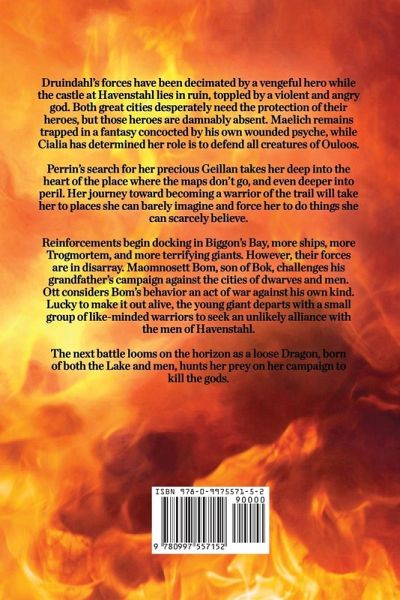 Druindahl's forces have been decimated by a vengeful hero while the castle at Havenstahl lies in ruin, toppled by a violent and angry god. Both great cities desperately need the protection of their heroes, but those heroes are damnably absent. Maelich remains trapped in a fantasy concocted by his own wounded psyche, while Cialia has determined her role is to defend all creatures of Ouloos. Perrin's search for her precious Geillan takes her deep into the heart of the place where the maps don't go, and even deeper into peril. Her journey toward becoming a warrior of the trail will take her to places she can barely imagine and force her to do things she can scarcely believe. Reinforcements begin docking in Biggon's Bay, more ships, more Trogmortem, and more terrifying giants. However, their forces are in disarray. Maomnosett Bom, son of Bok, challenges his grandfather's campaign against the cities of dwarves and men. Ott considers Bom's behavior an act of war against his own kind. Lucky to make it out alive, the young giant departs with a small group of like-minded warriors to seek an unlikely alliance with the men of Havenstahl. The next battle looms on the horizon as a loose Dragon, born of both the Lake and men, hunts her prey on her campaign to kill the gods.