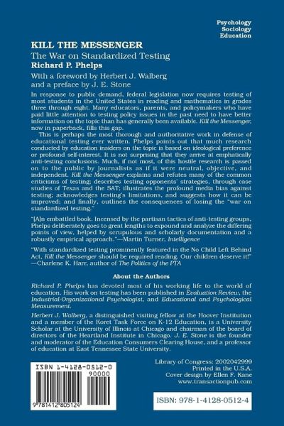 In response to public demand, federal legislation now requires testing of most students in the United States in reading and mathematics in grades three through eight. Many educators, parents, and policymakers who have paid little attention to testing policy issues in the past need to have better information on the topic than has generally been available. Kill the Messenger, now in paperback, fills this gap.This is perhaps the most thorough and authoritative work in defense of educational testing ever written. Phelps points out that much research conducted by education insiders on the topic is based on ideological preference or profound self-interest. It is not surprising that they arrive at emphatically anti-testing conclusions. Much, if not most, of this hostile research is passed on to the public by journalists as if it were neutral, objective, and independent. Kill the Messenger explains and refutes many of the common criticisms of testing; describes testing opponents' strategies, through case studies of Texas and the SAT; illustrates the profound media bias against testing; acknowledges testing's limitations, and suggests how it can be improved; and finally, outlines the consequences of losing the "war on standardized testing."