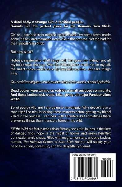 A dead body. A strange cult. A terrified people. Sounds like the perfect place for the Heinous Sara Slick. OK, so I escaped from magical prison, saved my home town, made some friends, and managed not to die in the process. Not too bad for the Heinous Sara Slick. But now what? Hobbes, mastermind of all things evil, has gone into hiding, and all my leads have dried up. With the Philosopher's Guild hot on my tail, the smart choice would be to lay low, bide my time, and take things easy. Or, I could investigate a brutal murder deep in the woods of rural Apalachia. Dead bodies keep turning up outside a small secluded community. And these bodies look weird. Like, giving-off-major-Farsider-vibes weird. So, of course Ally and I are going to investigate. Who doesn't love a road trip? The trick is solving these murders before getting my friend killed in the process. I can deal with Farsiders, but sometimes there are worse things than monsters living in the wild. Kill the Wild is a fast-paced urban fantasy book that laughs in the face of danger, finds hope in the midst of horror, and seeks heartfelt connection amid chaos. Filled with magic, monsters, and one badass human, The Heinous Crimes of Sara Slick Book 2 will satisfy your need for action, adventure, and the delightfully absurd. Buy Kill the Wild now!