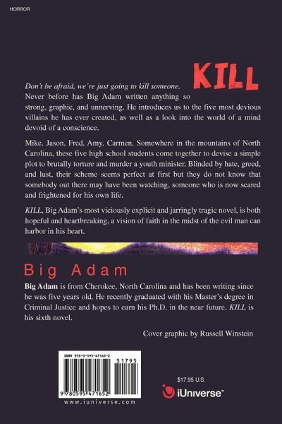 Don't be afraid, we're just going to kill someone. Never before has Big Adam written anything so strong, graphic, and unnerving. He introduces us to the five most devious villains he has ever created, as well as a look into the world of a mind devoid of a conscience. Mike. Jason. Fred. Amy. Carmen. Somewhere in the mountains of North Carolina, these five high school students come together to devise a simple plot to brutally torture and murder a youth minister. Blinded by hate, greed, and lust, their scheme seems perfect at first but they do not know that somebody out there may have been watching, someone who is now scared and frightened for his own life. KILL, Big Adam's most viciously explicit and jarringly tragic novel, is both hopeful and heartbreaking, a vision of faith in the midst of the evil man can harbor in his heart.