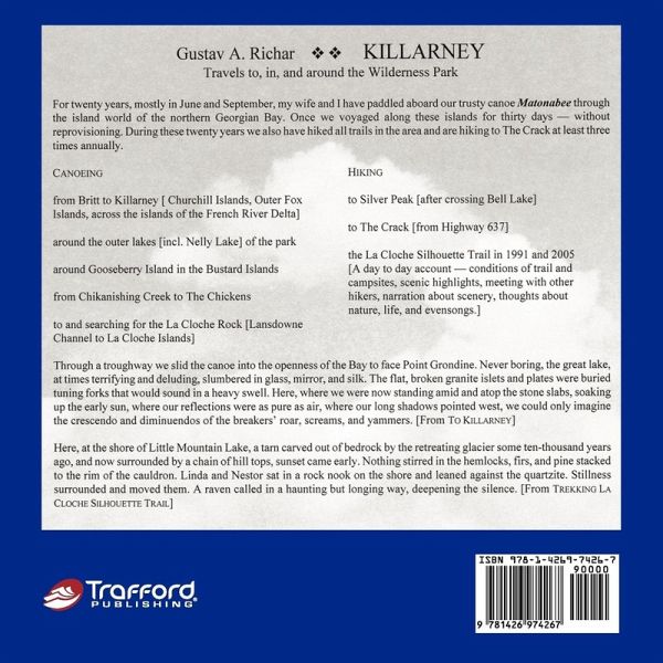 The nine travel essays and fifty colour photos presented in the book are reflecting many of the adventures, observations, and dreams my wife and I have experienced during our canoe trips to, in, and around Killarney and the wilderness park, as well as on our hiking tours in Killarney Provincial Park. For twenty years-mostly in June and September-we have paddled and trekked in this area of the northern Georgian Bay, recorded our impressions in diaries and on photos. These selected essays and pictures are a cross-section of those travels. We canoed along sculptured granite shores, camped on remote islands, hiked up hills and down dales on the 100-km-long La Cloche Silhouette Trail, and, with unrelenting happiness, watched sunsets. Being a musician I often imagined hearing symphonic music while looking across land and water, and recorded these impressions. I also referred to book passages I considered appropriate at certain moments while I was viewing the panorama in front of me.