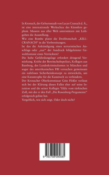 In Kronach, der Geburtsstadt Lucas Cranachs d. Ä., ist eine internationale Werkschau des Künstlers geplant. Museen aus aller Welt unterstützen mit Leihgaben die Ausstellung.Wie eine Bombe platzt die Drohbotschaft "Kill Cranach" in die Vorbereitungen.Ist das die Ankündigung eines terroristischen Anschlags, oder "nur" der Ausdruck fehlgeleiteter Gewaltfantasie eines Verrückten?Die hohe Gefährdungslage erfordert dringend Verstärkung. Kräfte der Bereitschaftspolizei, Kollegen aus Bamberg, des Landeskriminalamtes in München und sogar des amerikanischen FBI versuchen gemeinsam ein nahtloses Sicherheitskonzept zu entwickeln, um eine Katastrophe für die Kunstwelt zu verhindern. Der Kronacher Oberkommissar Götz Flößer verlässt sich bei der Klärung dieses Falles eher auf seine Intuition und die seiner Kollegin Yildiz vom türkischen Zoll, mit der er den Fall "Die Rosenbergs Pergamente" erfolgreich gelöst hat.Vergeblich, wie sich zeigt. Oder doch nicht?
