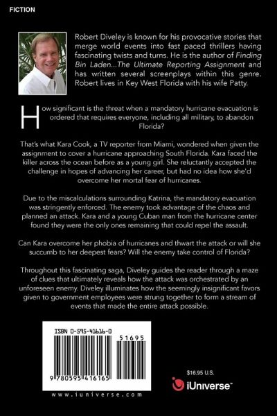 How significant is the threat when a mandatory hurricane evacuation is ordered that requires everyone, including all military, to abandon Florida? That's what Kara Cook, a TV reporter from Miami, wondered when given the assignment to cover a hurricane approaching South Florida. Kara faced the killer across the ocean before as a young girl. She reluctantly accepted the challenge in hopes of advancing her career, but had no idea how she'd overcome her mortal fear of hurricanes. Due to the miscalculations surrounding Katrina, the mandatory evacuation was stringently enforced. The enemy took advantage of the chaos and planned an attack. Kara and a young Cuban man from the hurricane center found they were the only ones remaining that could repel the assault. Can Kara overcome her phobia of hurricanes and thwart the attack or will she succumb to her deepest fears? Will the enemy take control of Florida? Throughout this fascinating saga, Diveley guides the reader through a maze of clues that ultimately reveals how the attack was orchestrated by an unforeseen enemy. Diveley illuminates how the seemingly insignificant favors given to government employees were strung together to form a stream of events that made the entire attack possible.
