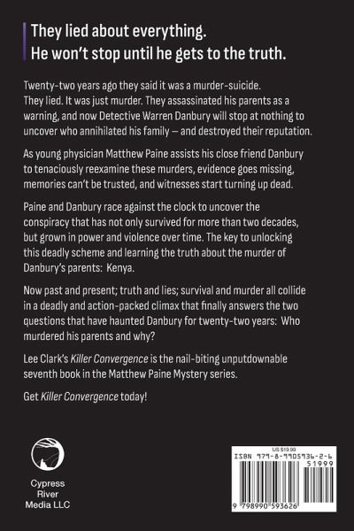 They lied about everything.He won't stop until he gets to the truth. Twenty-two years ago they said it was a murder-suicide. They lied. It was just murder. They assassinated his parents as a warning, and now Detective Warren Danbury will stop at nothing to uncover who annihilated his family - and destroyed their reputation. As young physician Matthew Paine assists his close friend Danbury to tenaciously reexamine these murders, evidence goes missing, memories can't be trusted, and witnesses start turning up dead. Paine and Danbury race against the clock to uncover the conspiracy that has not only survived for more than two decades, but grown in power and violence over time. The key to unlocking this deadly scheme and learning the truth about the murder of Danbury's parents: Kenya. Now past and present; truth and lies; survival and murder all collide in a deadly and action-packed climax that finally answers the two questions that have haunted Danbury for twenty-two years: Who murdered his parents and why? Lee Clark's Killer Convergence is the nail-biting unputdownable seventh book in the Matthew Paine Mystery series. Get Killer Convergence today!