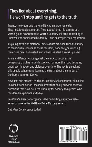 They lied about everything.He won't stop until he gets to the truth. Twenty-two years ago they said it was a murder-suicide. They lied. It was just murder. They assassinated his parents as a warning, and now Detective Warren Danbury will stop at nothing to uncover who annihilated his family - and destroyed their reputation. As young physician Matthew Paine assists his close friend Danbury to tenaciously reexamine these murders, evidence goes missing, memories can't be trusted, and witnesses start turning up dead. Paine and Danbury race against the clock to uncover the conspiracy that has not only survived for more than two decades, but grown in power and violence over time. The key to unlocking this deadly scheme and learning the truth about the murder of Danbury's parents: Kenya. Now past and present; truth and lies; survival and murder all collide in a deadly and action-packed climax that finally answers the two questions that have haunted Danbury for twenty-two years: Who murdered his parents and why? Lee Clark's Killer Convergence is the nail-biting unputdownable seventh book in the Matthew Paine Mystery series. Get Killer Convergence today!