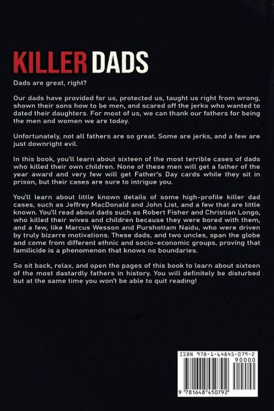 Dads are great, right? Our dads have provided for us, protected us, taught us right from wrong, shown their sons how to be men, and scared off the jerks who wanted to dated their daughters. For most of us, we can thank our fathers for being the men and women we are today. Unfortunately, not all fathers are so great. Some are jerks, and a few are just downright evil. In this book, you'll learn about sixteen of the most terrible cases of dads who killed their own children. None of these men will get a father of the year award and very few will get Father's Day cards while they sit in prison, but their cases are sure to intrigue you. You'll learn about little-known details of some high-profile killer dad cases, such as Jeffrey MacDonald and John List, and a few that are little known. You'll read about dads such as Robert Fisher and Christian Longo, who killed their wives and children because they were bored with them, and a few, like Marcus Wesson and Purshottam Naidu, who were driven by truly bizarre motivations. These dads, and two uncles, span the globe and come from different ethnic and socio-economic groups, proving that familicide is a phenomenon that knows no boundaries. So sit back, relax, and open the pages of this book to learn about sixteen of the most dastardly fathers in history. You will definitely be disturbed but at the same time you won't be able to quit reading!