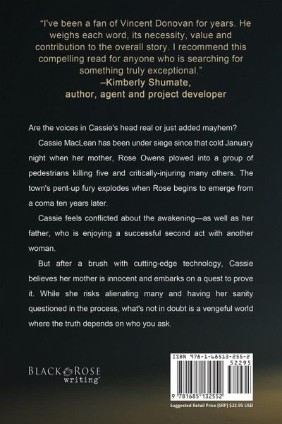 Are the voices in Cassie's head real or just added mayhem? Cassie MacLean has been under siege since that cold January night when her mother, Rose Owens plowed into a group of pedestrians killing five and critically-injuring many others. The town's pent-up fury explodes when Rose begins to emerge from a coma ten years later. Cassie feels conflicted about the awakening-as well as her father, who is enjoying a successful second act with another woman. But after a brush with cutting-edge technology, Cassie believes her mother is innocent and embarks on a quest to prove it. While she risks alienating many and having her sanity questioned in the process, what's not in doubt is a vengeful world where the truth depends on who you ask.