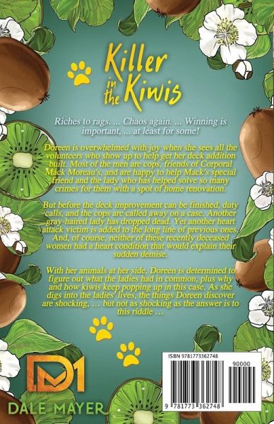 Riches to rags. ... Chaos again. ... Winning is important, ... at least for some! Doreen is overwhelmed with joy when she sees all the volunteers who show up to help get her deck addition built. Most of the men are cops, friends of Corporal Mack Moreau's, and are happy to help Mack's special friend and the lady who has helped solve so many crimes for them with a spot of home renovation. But before the deck improvement can be finished, duty calls, and the cops are called away on a case. Another gray-haired lady has dropped dead. Yet another heart attack victim is added to the long line of previous ones. And, of course, neither of these recently deceased women had a heart condition that would explain their sudden demise. With her animals at her side, Doreen is determined to figure out what the ladies had in common, plus why and how kiwis keep popping up in this case. As she digs into the ladies' lives, the things Doreen discover are shocking, ... but not as shocking as the answer is to this riddle ...