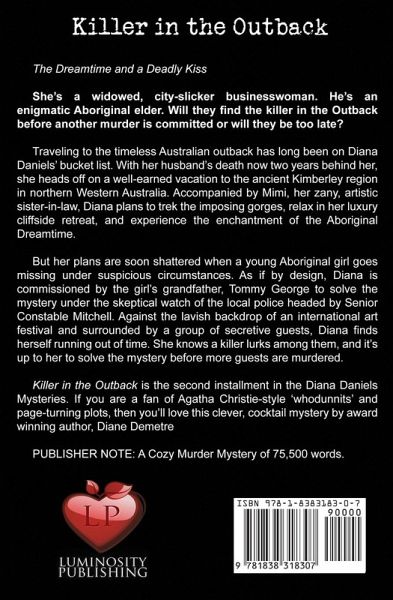 The Dreamtime and a Deadly Kiss She's a widowed, city-slicker businesswoman. He's an enigmatic Aboriginal elder. Will they find the killer in the Outback before another murder is committed or will they be too late? Traveling to the timeless Australian outback has long been on Diana Daniels' bucket list. With her husband's death now two years behind her, she heads off on a well-earned vacation to the ancient Kimberley region in northern Western Australia. Accompanied by Mimi, her zany, artistic sister-in-law, Diana plans to trek the imposing gorges, relax in her luxury cliffside retreat, and experience the enchantment of the Aboriginal Dreamtime. But her plans are soon shattered when a young Aboriginal girl goes missing under suspicious circumstances. As if by design, Diana is commissioned by the girl's grandfather, Tommy George to solve the mystery under the skeptical watch of the local police headed by Senior Constable Mitchell. Against the lavish backdrop of an international art festival and surrounded by a group of secretive guests, Diana finds herself running out of time. She knows a killer lurks among them, and it's up to her to solve the mystery before more guests are murdered. Killer in the Outback is the second installment in the Diana Daniels Mysteries. If you are a fan of Agatha Christie-style 'whodunnits' and page-turning plots, then you'll love this clever, cocktail mystery by award winning author, Diane Demetre. PUBLISHER NOTE: A Cozy Murder Mystery of 75,500 words.