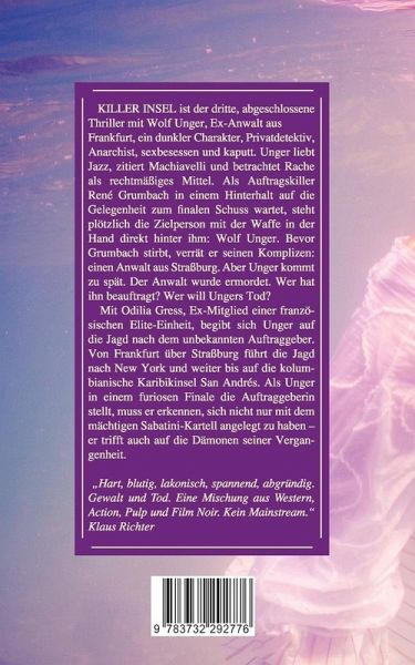 KILLER INSEL ist der dritte, abgeschlossene Thriller mit Wolf Unger, Ex-Anwalt aus Frankfurt, ein dunkler Charakter, Privatdetektiv, Anarchist, sexbesessen und kaputt. Unger liebt Jazz, zitiert Machiavelli und betrachtet Rache als rechtmäßiges Mittel.Als Aufttragskiller René Grumbach in einem Hinterhalt auf die Gelegenheit zum finalen Schuss wartet, steht plötzlich die Zielperson mit der Waffe in der Hand direkt hinter ihm: Wolf Unger. Bevor Grumbach stirbt, verrät er seinen Komplizen: einen Anwalt aus Straßburg. Aber Unger kommt zu spät. Der Anwalt wurde ermordet. Wer hat ihn beauftragt? Wer will Ungers Tod?Mit Odilia Gress, Ex-Mitglied einer französischen Elite-Einheit, begibt sich Unger auf die Jagd nach dem unbekannten Auftraggeber. Von Frankfurt über Straßburg führt die Jagd nach New York und weiter bis auf die kolumbianische Karibikinsel San Andrés. Als Unger in einem furiosen Finale die Auftraggeberin stellt, muss er erkennen, sich nicht nur mit dem mächtigen Sabatini-Kartell angelegt zu haben - er trifft auch auf die Dämonen seiner Vergangenheit."Hart, blutig, lakonisch, spannend, abgründig. Gewalt und Tod. Eine Mischung aus Western, Action, Pulp und Film Noir. Kein Mainstream." Klaus Richter
