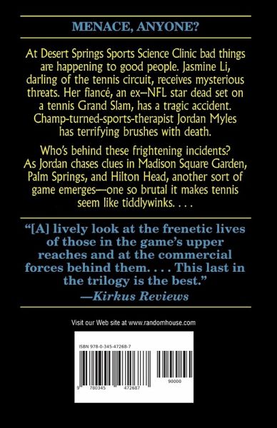 MENACE, ANYONE? At Desert Springs Sports Science Clinic bad things are happening to good people. Jasmine Li, darling of the tennis circuit, receives mysterious threats. Her fiancé, an ex-NFL star dead set on a tennis Grand Slam, has a tragic accident. Champ-turned-sports-therapist Jordan Myles has terrifying brushes with death. Who's behind these frightening incidents? As Jordan chases clues in Madison Square Garden, Palm Springs, and Hilton Head, another sort of game emerges--one so brutal it makes tennis seem like tiddlywinks. . . .