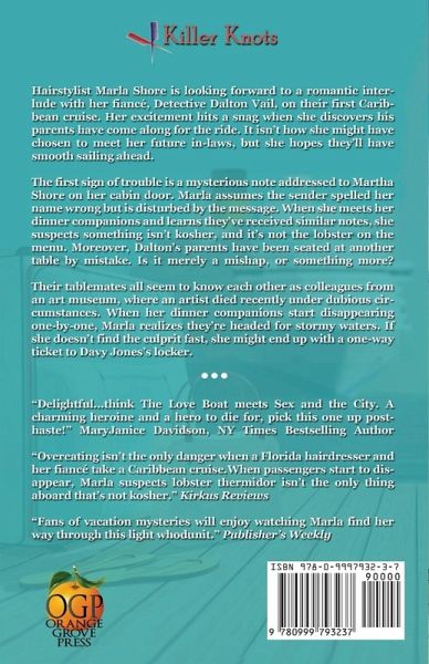 Set sail for murder and mayhem when hairstylist Marla Shore and her fiancé cruise to the Caribbean with a killer on board in this cruise ship cozy mystery. Hairstylist Marla Shore is looking forward to a romantic interlude with her fiancé, Detective Dalton Vail, on their first Caribbean cruise. Her excitement hits a snag when she discovers his parents have come along for the ride. It isn't how she might have chosen to meet her future in-laws, but she hopes they'll have smooth sailing ahead. The first sign of trouble is a mysterious note addressed to Martha Shore on her cabin door. Marla assumes the sender spelled her name wrong but is disturbed by the message. When she meets her dinner companions and learns they've received similar notes, she suspects something isn't kosher, and it's not the lobster on the menu. Moreover, Dalton's parents have been seated at another table by mistake. Is it merely a mishap, or something more? Their tablemates all seem to know each other as colleagues from an art museum, where an artist died recently under dubious circumstances. When her dinner companions start disappearing one-by-one, Marla realizes they're headed for stormy waters. If she doesn't find the culprit fast, she might end up with a one-way ticket to Davy Jones's locker. "Delightful...The Love Boat meets Sex and the City. A charming heroine and a hero to die for, pick this one up posthaste!" MaryJanice Davidson, NY Times Bestselling Author