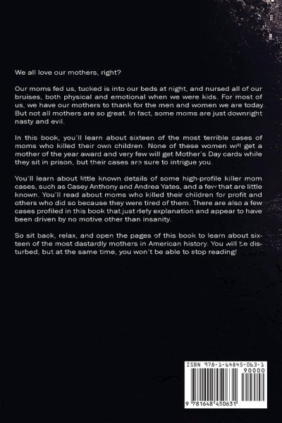 We all love our mothers, right? Our moms fed us, tucked is into our beds at night, and nursed all of our bruises, both physical and emotional when we were kids. For most of us, we have our mothers to thank for the men and women we are today. But not all mothers are so great. In fact, some moms are just downright nasty and evil. In this book, you'll learn about sixteen of the most terrible cases of moms who killed their own children. None of these women will get a mother of the year award and very few will get Mother's Day cards while they sit in prison, but their cases are sure to intrigue you. You'll learn about little known details of some high-profile killer mom cases, such as Casey Anthony and Andrea Yates, and a few that are little known. You'll read about moms who killed their children for profit and others who did so because they were tired of them. There are also a few cases profiled in this book that just defy explanation and appear to have been driven by no motive other than insanity. So sit back, relax, and open the pages of this book to learn about sixteen of the most dastardly mothers in American history. You will be disturbed, but at the same time, you won't be able to stop reading!