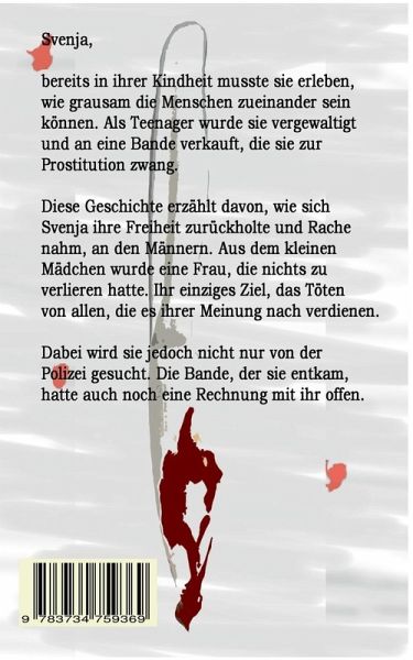 Svenja,bereits in ihrer Kindheit musste sie erleben, wie grausam die Menschen zueinander sein können. Als Teenager wurde sie vergewaltigt und an eine Bande verkauft, die sie zur Prostitution zwang.Diese Geschichte erzählt davon, wie sich Svenja ihre Freiheit zurückholte und Rache nahm, an den Männern. Aus dem kleinen Mädchen wurde eine Frau, die nichts zu verlieren hatte. Ihr einziges Ziel, das Töten von allen, die es ihrer Meinung nach verdienen.Dabei wird sie jedoch nicht nur von der Polizei gesucht. Die Bande, der sie entkam, hatte auch noch eine Rechnung mit ihr offen.