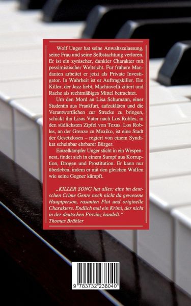 Wolf Unger hat seine Anwaltszulassung, seine Frau und seine Selbstachtung verloren. Er ist ein zynischer, dunkler Charakter mit pessimistischer Weltsicht. Für frühere Mandanten arbeitet er jetzt als Private Investigator. In Wahrheit ist er Auftragskiller. Ein Killer, der Jazz liebt, Machiavelli zitiert und Rache als rechtmäßiges Mittel betrachtet. Um den Mord an Lisa Schumann, einer Studentin aus Frankfurt, aufzuklären und die Verantwortlichen zur Strecke zu bringen, schickt ihn Lisas Vater nach Los Robles, in den südlichsten Zipfel von Texas. Los Robles, an der Grenze zu Mexiko, ist eine Stadt der Gestzlosen, regiert von einem Syndikat scheinbar ehrbarer Bürger.Einzelkämpfer Unter sticht in ein Wespennest, findet sich in einem Sumpf aus Korruption, Drogen und Prostitution. Er kann nur überleben, indem er mit den gleichen Waffen wie seine Gegner kämpft."KILLER SONG hat alles: eine im deutschen Crime Genre noch nicht da gewesene Hauptperson, rasanten Plot und originelle Charaktere. Endlich mal ein Krimi, der nicht in der deutschen Provinz handelt."Thomas Brähler