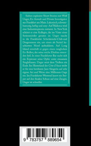 Killer Stories - Wolf Unger Short ThrillsSieben Short Thrills. Packende, sprachlich virtuose Schilderung von P.J. Mulders getriebenen Figuren. Hammerhart, lakonisch, schwarzhumorig, heftig. Mit Wolf Unger, cool und sexsüchtig. dem schwärzesten Ermittler des Thriller-Genres. Auf Mallorca wird eine Industrie-Spionin enttarnt. In New York schützt er eine Kollegin, die ins Visier eines Serienmörders geraten ist. Unger taucht in die Frank- furter Schickimicki-Club- und Drogenszene ein, um einen als Suizid kaschierten Mord aufzuklären. Auf Long Island ermittelt er gegen einen ranghohen Ex-Bullen, der seine reiche Ehefrau ermorden ließ. In einer Frankfurter Bar sucht sich ein Erpresser seine Opfer unter einsamen Singlefrauen. Unger setzt dem Treiben ein Ende. Im Hin- terland der Côte d'Azur treibt er für eine berühmte Jazzsängerin auf sehr eigene Art und Weise eine Millionengage ein. Im Frankfurter Westend lauert ein Sniper auf den finalen Schuss auf eine Zeugin. Unger ist schneller.