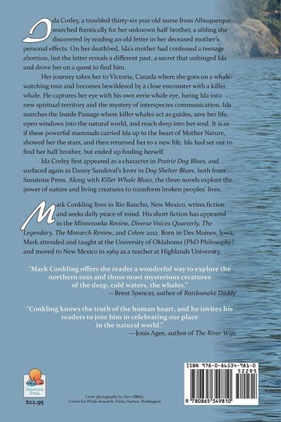 Ida Corley, a troubled thirty-six year old nurse from Albuquerque is searching for her unknown half-brother, a sibling she discovered by reading an old letter in her deceased mother's personal effects. On her deathbed, Ida's mother had confessed a teenage abortion, but the letter reveals a different past, a secret that unhinged Ida and drove her on a quest to find him. Her journey takes her to Victoria, Canada where she goes on a whale watching tour and becomes bewildered by a close encounter with a killer whale. He captures her eye with his own eerie whale eye, luring Ida into new spiritual territory and the mystery of interspecies communication. Ida searches the Inside Passage where killer whales act as guides, save her life, open windows into the natural world, and reach deep into her soul. It is as if these powerful mammals carried Ida up to the heart of Mother Nature, showed her the stars, and then returned her to a new life. Ida had set out to find her half-brother, but ended up finding herself. Ida Corley first appeared as a character in "Prairie Dog Blues," and surfaced again as Danny Sandoval's lover in "Dog Shelter Blues," both from Sunstone Press. Along with "Killer Whale Blues," the three novels explore the power of nature and living creatures to transform broken peoples' lives. Mark Conkling's latest novel in this series is "Honey Bee Blues."