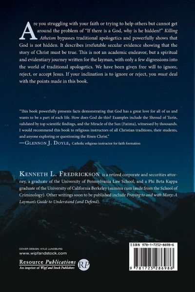 Are you struggling with your faith or trying to help others but cannot get around the problem of ""If there is a God, why is he hidden?"" Killing Atheism bypasses traditional apologetics and powerfully shows that God is not hidden. It describes irrefutable secular evidence showing that the story of Christ must be true. This is not an academic endeavor, but a spiritual and evidentiary journey written for the layman, with only a few digressions into the world of traditional apologetics. We have been given free will to ignore, reject, or accept Jesus. If your inclination is to ignore or reject, you must deal with the points made in this book.