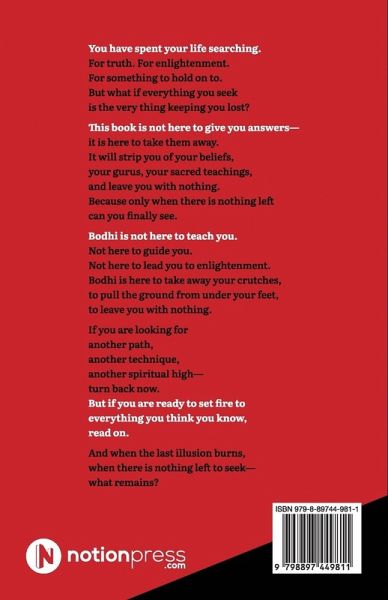 You have spent your life searching. For truth. For enlightenment. For something to hold on to. But what if everything you seek is the very thing keeping you lost? This book is not here to give you answers- it is here to take them away. It will strip you of your beliefs, your gurus, your sacred teachings, and leave you with nothing. Because only when there is nothing left can you finally see. Bodhi is not here to teach you. Not here to guide you. Not here to lead you to enlightenment. Bodhi is here to take away your crutches, to pull the ground from under your feet, to leave you with nothing. If you are looking for another path, another technique, another spiritual high- turn back now. But if you are ready to set fire to everything you think you know, read on. And when the last illusion burns, when there is nothing left to seek- what remains?