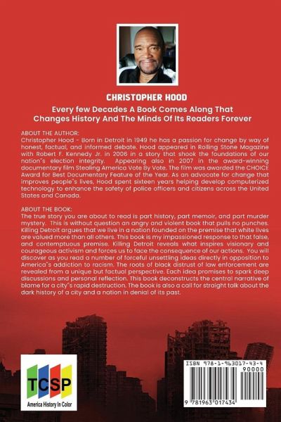 Dealing CIA Cocaine... And A City Dies! Killing Detroit pulls the sheets off a well-planned government scheme that left broken neighborhoods, fractured families, and dead bodies in its wake. Over fifty years later, Detroit is still reeling from this scheme of murder and financial destruction. For the first time since before the Civil War, Detroit is no longer among the nation's 20 most populous cities. Detroit's population was 677,116 last summer, a loss of 3,107 residents from the previous year, according to the U.S. Census Bureau. That loss was enough to drop the city to the 21st largest city in the nation, surpassed by Seattle, Denver, and, of all places, El Paso, Texas. At one time, Detroit was the richest and fourth largest city in America, behind New York, Chicago, and Philadelphia. Killing Detroit exposes the critical events behind the rapid decline of this once-great city. About Killing Detroit Killing Detroit is the true story of a black activist searching for justice. Carl, a lifelong resident of Detroit, notices rampant drug dealing on the streets of the city's black neighborhoods. Drug houses and street dealers have the protection of the Detroit Police Department. Carl is outraged and forms a group to expose the corruption inside the FBI and Detroit Police Department. His tireless efforts resulted in a series of unexpected and violent attacks by the federal government. Killing Detroit reveals in detail for the first time the plot to destroy a city and its citizens and the voices of dissent. Learn what transformed this once-thriving city into the nation's most notorious drug den almost overnight. The award-winning screenplay is now in book form order today!