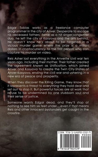 Edgar Tobias works as a freelance computer programmer in the city of Anver. Desperate to escape his deceased fathers' fame as a hit singer-songwriter duo, he left the city of Kasyova and the arts behind. He doesn't know he's about to be targeted in a vicious murder game where the prize is a million dollars in cryptocurrency to the first person who can capture his murder on video. Reis Asher lost everything in the Anverite civil war ten years ago, including their mother. Their father created the agreement known as Unification, which joined Anver and Kasyova to create the Twin City-States of Anver-Kasyova, ending the civil war and ushering in a new era of peace and prosperity. When they discover the Killing Game, they know that it represents a threat to everything they hold dear and set out to stop it. But powerful forces are at work that refuse to be undermined by one stubborn soul and their sense of justice. Someone wants Edgar dead, and they'll stop at nothing to see him six feet under... even if that means Reis and other innocent bystanders get caught in the crossfire.
