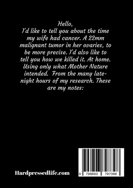 Hello, I would like to tell you about the time my wife had cancer. I would also like to tell you how we killed it. At home. Using only what Mother Nature intended. From the many late-night hours of my research. These are my notes: