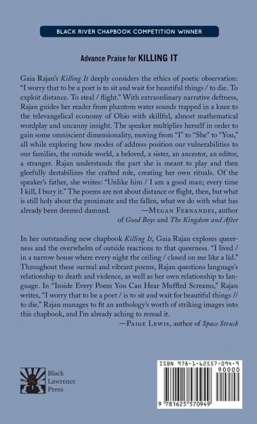 Winner of the Spring 2021 Black River Chapbook Competition Poet Gaia Rajan's second short collection is a razor-sharp interrogation of queer Asian American identity, intergenerational trauma, and the detritus of American achievement. Here, lineage is at once redemptive and violent: "Sometimes / when people say I'm killing it I remember everything / exemplary I know or ever will traces back to a small girl / on the floor praying please, please, make them see me." In this steely gut-punch of a collection, Rajan's speakers don't flinch, even when confronted with their own dissolution. They haunt ghost towns and cheer on bank robbers; they wake in the middle of the night with visceral dreams of a centuries-old genocide, trying to remember "how to coax a howl to eat;" they grasp for myths sturdy enough to hold, emerging empty-handed and furious. Killing It is vibrant, disquieting, a collection that demands to be read with reverence and abandon. ---------------------------------------- "Gaia Rajan's KILLING IT deeply considers the ethics of poetic observation: 'I worry that to be a poet is to sit and wait for beautiful things / to die. To exploit distance. To steal / flight.' With extraordinary narrative deftness, Rajan guides her reader from phantom water sounds trapped in a knee to the televangelical economy of Ohio with skillful, almost mathematical wordplay and uncanny insight. The speaker multiplies herself in order to gain some omniscient dimensionality, moving from 'I' to 'She' to 'You, ' all while exploring how modes of address position our vulnerabilities to our families, the outside world, a beloved, a sister, an ancestor, an editor, a stranger. Rajan understands the part she is meant to play and then gleefully destabilizes the crafted role, creating her own rituals. Of the speaker's father, she writes: 'Unlike him / I am a good man; every time I kill, I bury it.' The poems are not about distance or flight, then, but what is still holy about the proximate and the fallen, what we do with what has already been deemed damned." -Megan Fernandes, author of Good Boys and The Kingdom and After "In her outstanding new chapbook KILLING IT, Gaia Rajan explores queerness and the overwhelm of outside reactions to that queerness. 'I lived / in a narrow house where every night the ceiling / closed on me like a lid.' Throughout these surreal and vibrant poems, Rajan questions language's relationship to death and violence, as well as her own relationship to language. In 'Inside Every Poem You Can Hear Muffled Screams, ' Rajan writes, 'I worry that to be a poet / is to sit and wait for beautiful things // to die.' Rajan manages to fit an anthology's worth of striking images into this chapbook, and I'm already aching to reread it." -Paige Lewis, author of Space Struck